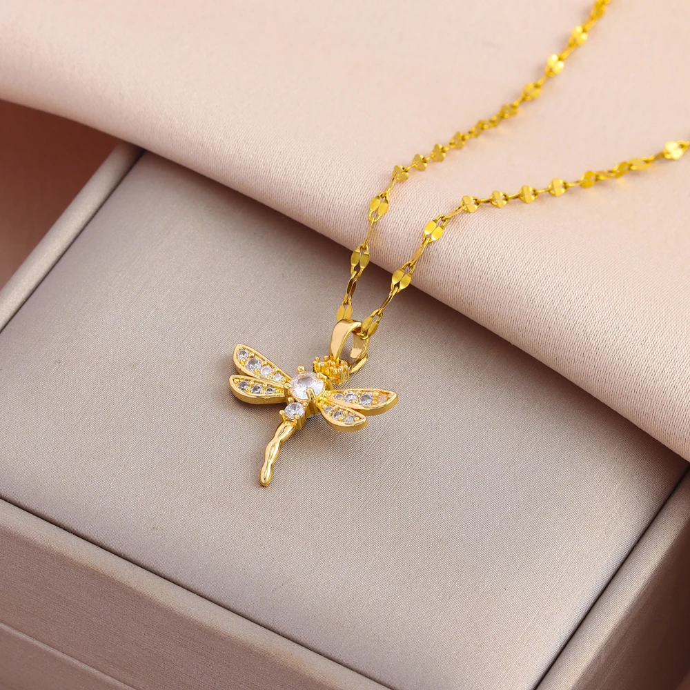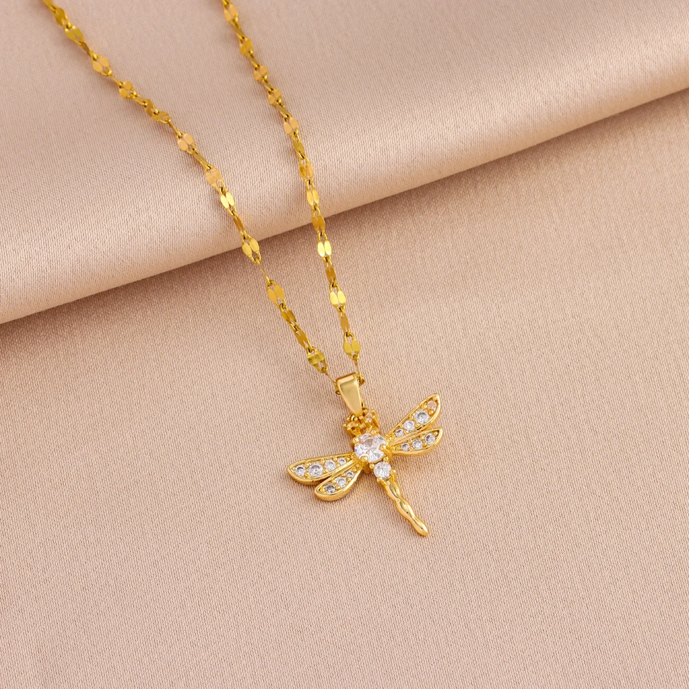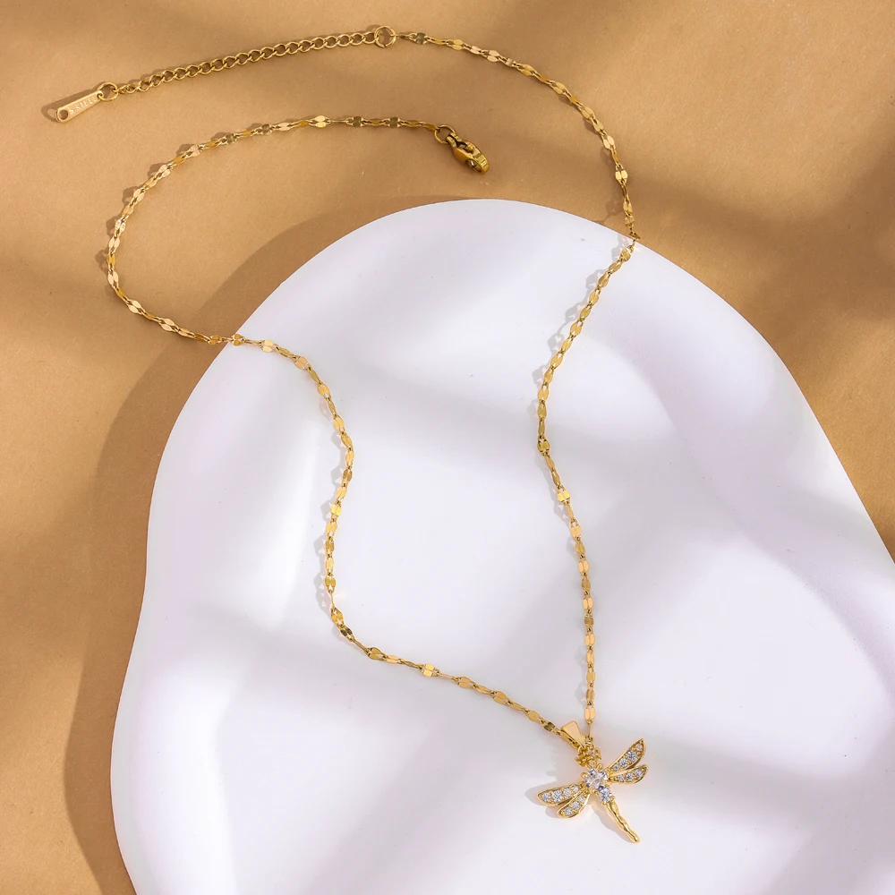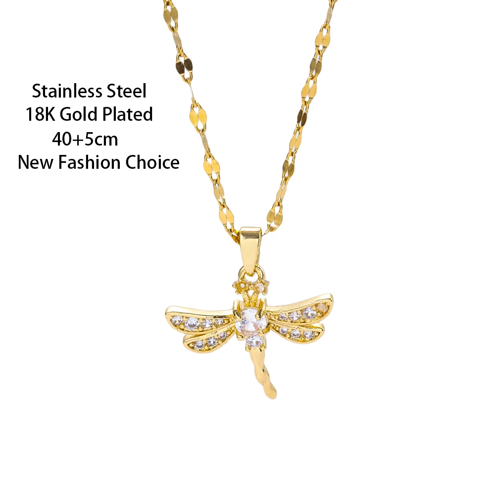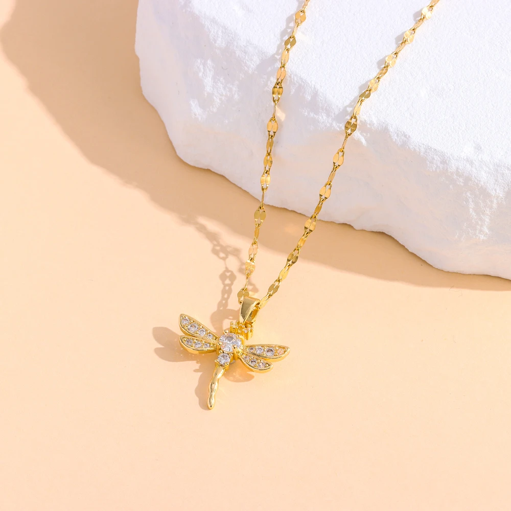 New 18K Gold Plated Zircon Inlaid Cute Dragonfly Pendant Necklace